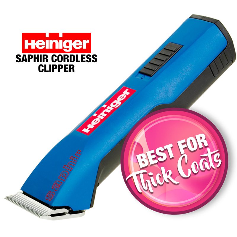 - £199Heiniger has released the Heiniger Saphir corded version. This has all the great features of the Cordless plus a bit of extra power as it runs straight of the mains. This slim and comfortable to hold clipper takes all A5 snap on blades, has a cool running motor and is quiet enough for small nervous dogs but powerful enough for larger dogs and thicker coat types.