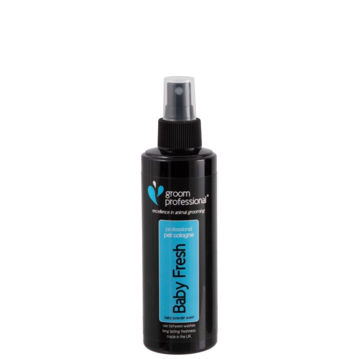 Baby Fresh Cologne is by far our best selling Groom Professional cologne and gives every dog that sweet pleasant familiar Baby Powder smell. This cologne is long-lasting and only needs a few squirts at a time. Brilliant to freshen up pets between and after washes. Helps mask any not so nice doggie odours. Also great as a nice finishing touch for groomers