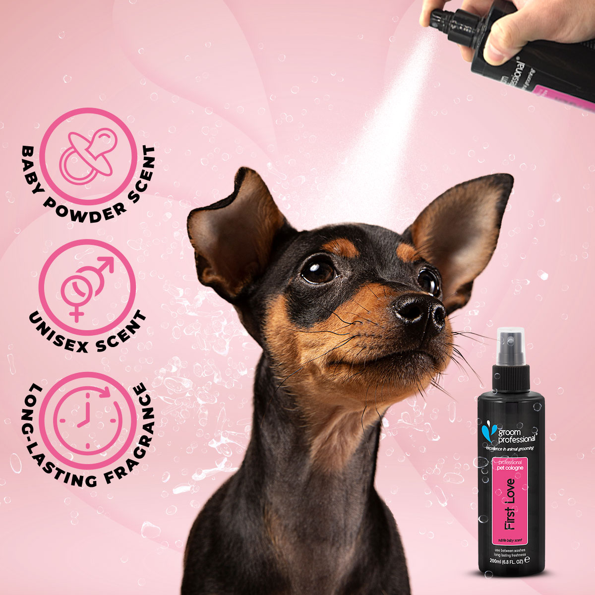 Enhance the freshness by pairing First Love Dog Cologne with Groom Professional Baby Fresh Shampoo for a complete and cuddly grooming experience.
