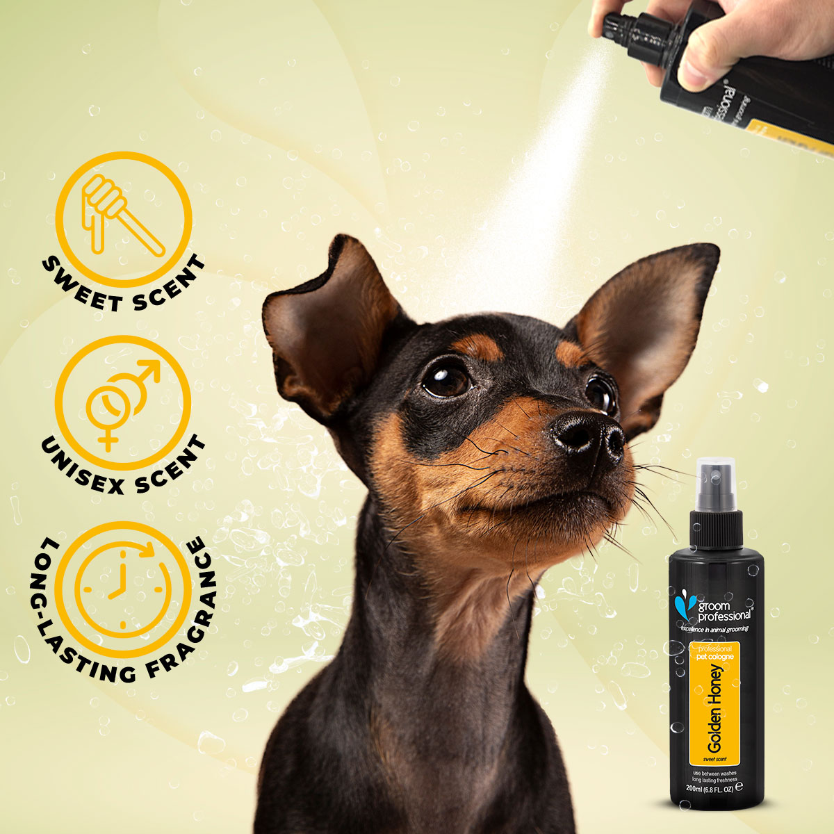 Indulge your pet in the sweet and fresh aroma of Groom Professional Golden Honey Dog Cologne. Perfect for those who adore sweet scents, this unisex fragrance offers a rich, sweet scent that lingers on your pet's coat for days, without being overpowering. Ideal for both male and female dogs, this cologne ensures your pet smells fresh and heavenly long after application.