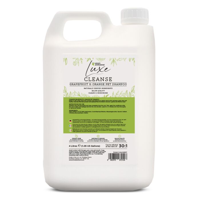 Groom Professional Luxe Grapefruit & Orange Cleanse Shampoo is designed for dogs who love to get dirty! With mild cleansers and a refreshing citrus fragrance, this salon-quality shampoo gently removes dirt and odours, leaving the coat clean, healthy, and fresh. Made with naturally derived ingredients, free from parabens and sulphates, for a gentle yet effective clean.