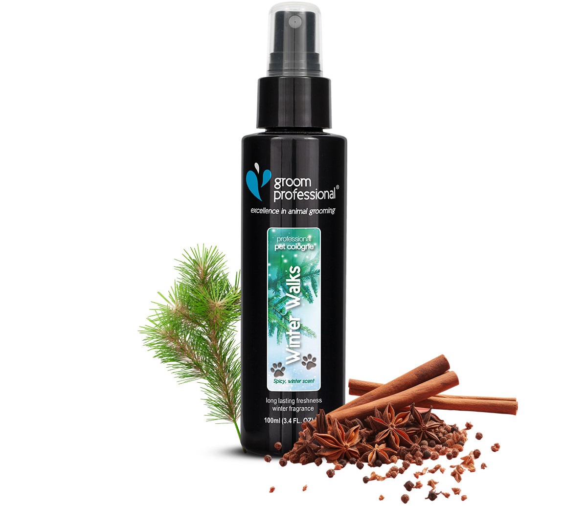 Experience the crisp and invigorating scent of Groom Professional Winter Walks Dog Cologne, a fragrance that captures the essence of fresh winter strolls with your furry best friend. This festive cologne features a spicy blend of clove and cinnamon, enhanced by natural notes of eucalyptus and fir. Infused with Cedarwood essential oil, this top-quality scent is designed to linger on your pet’s coat for days, making it the perfect finishing touch after grooming or a refreshing spritz between baths.
