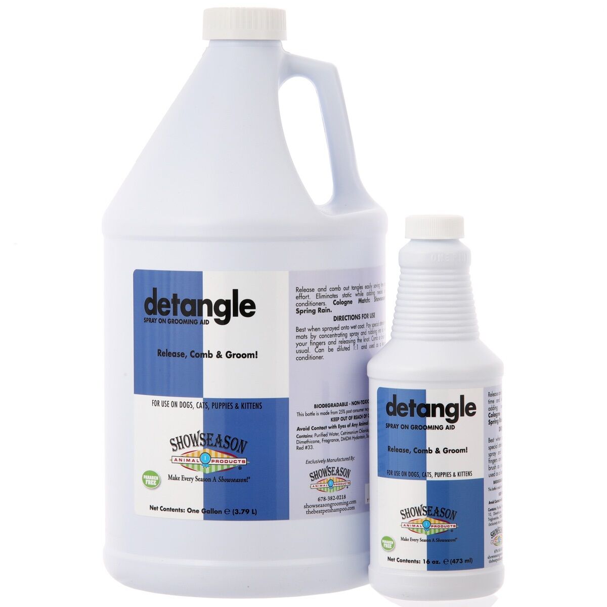 Show Season Detangle Spray saves you time and effort by releasing tangles to allow them to be combed out easily! This detangling spray also conditions the coat and prevents static and frizziness. For best results, spray directly into wet mats. Can also be diluted 2:1 and used as a leave-in conditioner.