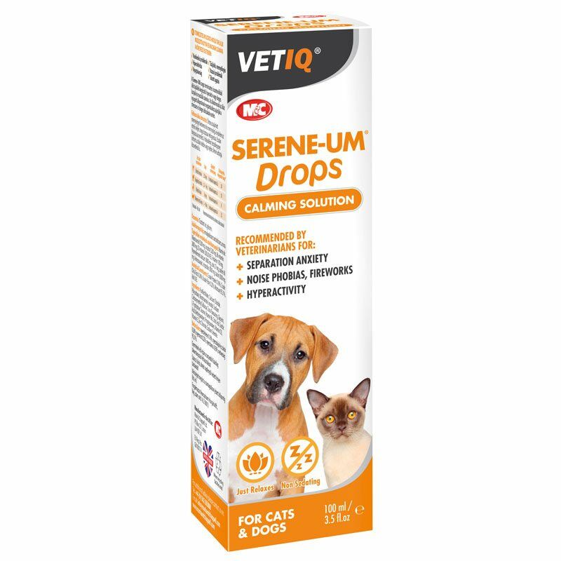 Vet IQ Serene-Um Drops for dogs and cats is a natural food supplement that can be poured onto your pet's food to induce calmness.